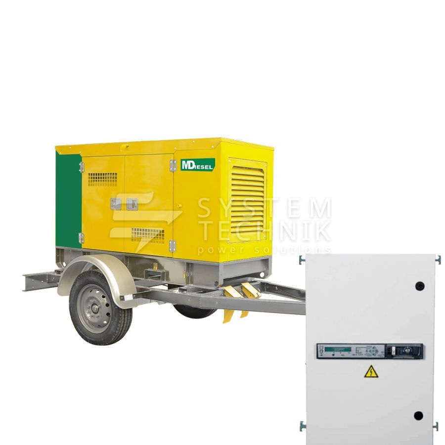 - MitsuDiesel МД ЭД-150-Т400-2РКМ29 в шумозащитном кожухе на шасси с АВР на прицепе