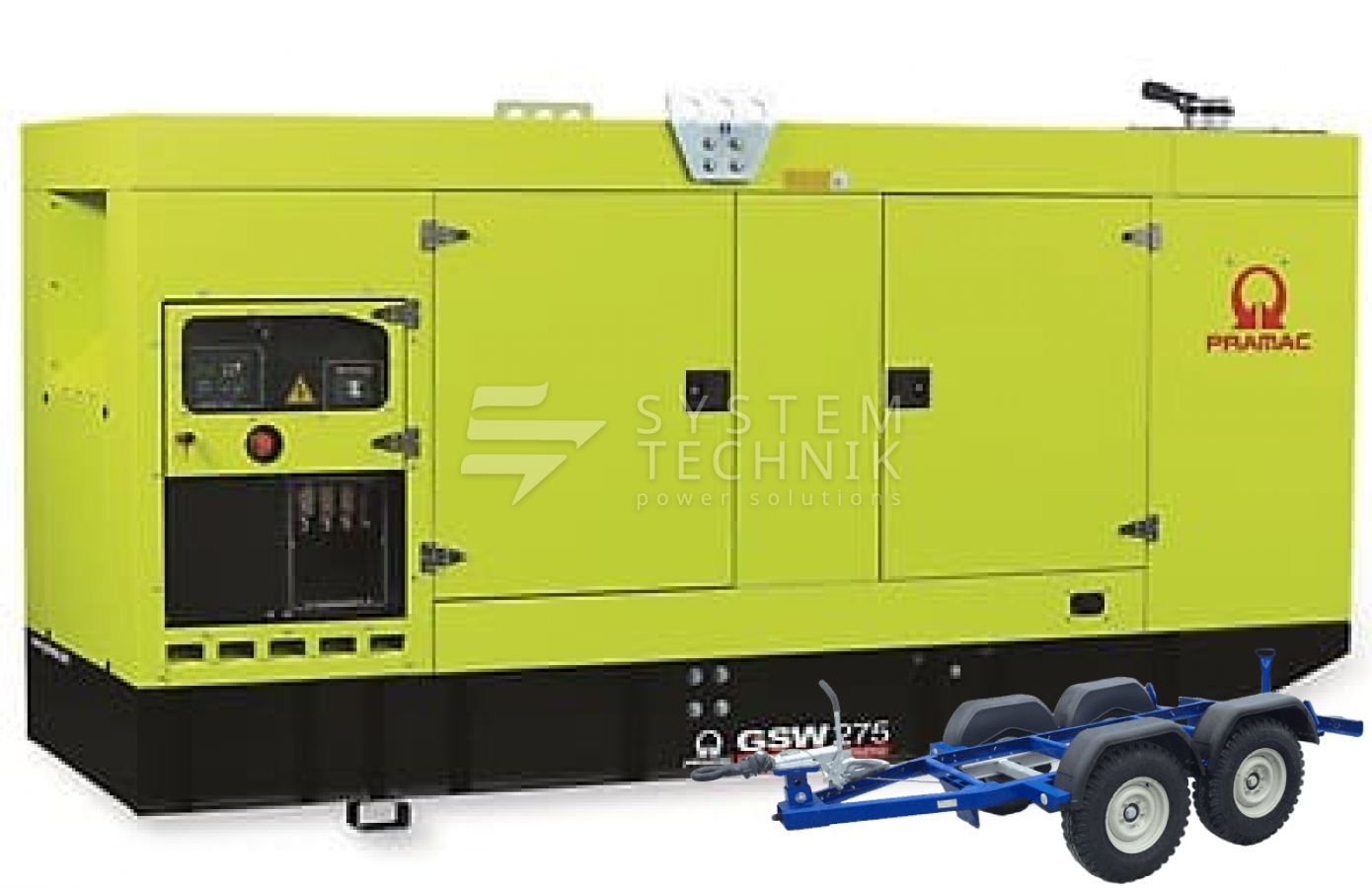 - Дизельный генератор Pramac GSW 275 DO 400V В кожухе на прицепе